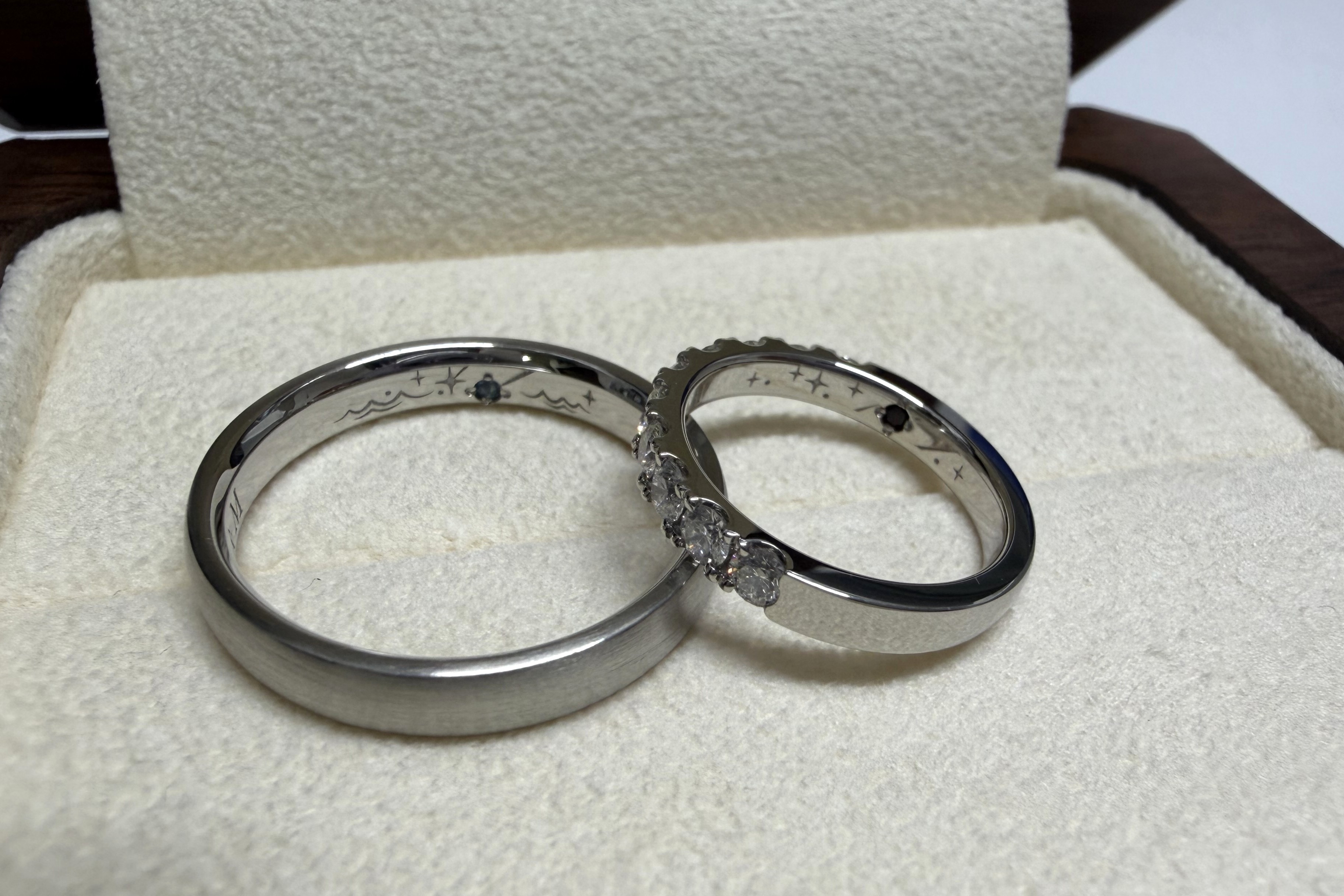 今回の指輪は、お二人の思い出の地である九十九里浜の満点の星空を内側にオリジナルモチーフとしてお入れしたデザインでございます。