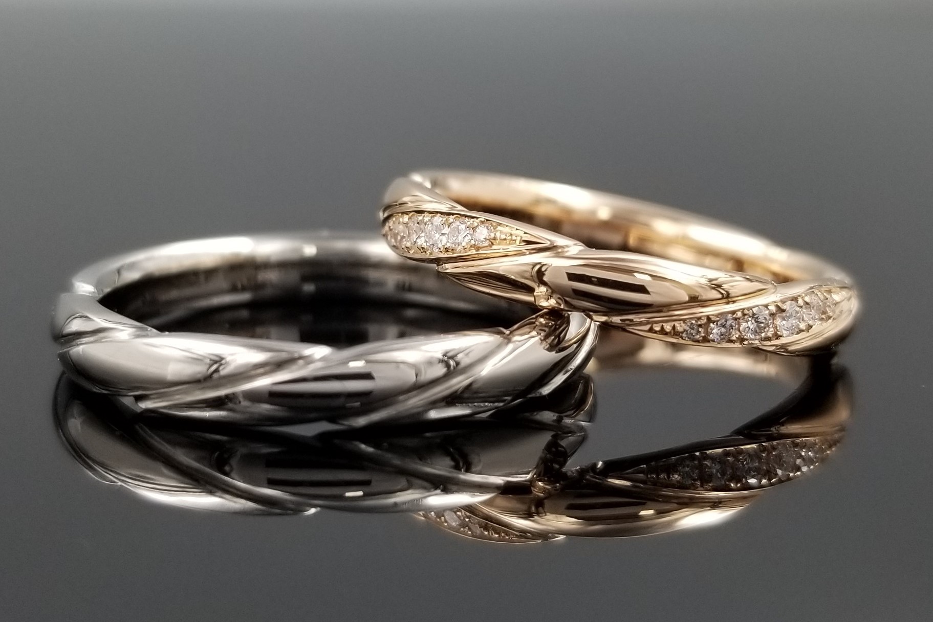 ご結婚指輪は、モコモコとしたベースはお二人でお揃いにして、