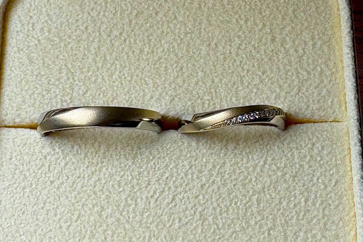 奥様の指輪には、表面のシャンパンゴールドにひとすじの流星が走るようにダイヤをセッティング。大きさや範囲も慎重にご相談を重ねた結果、カジュアルからエレガントまで幅広いシーンに合わせて頂ける、素敵なご結婚指輪が完成致しました。