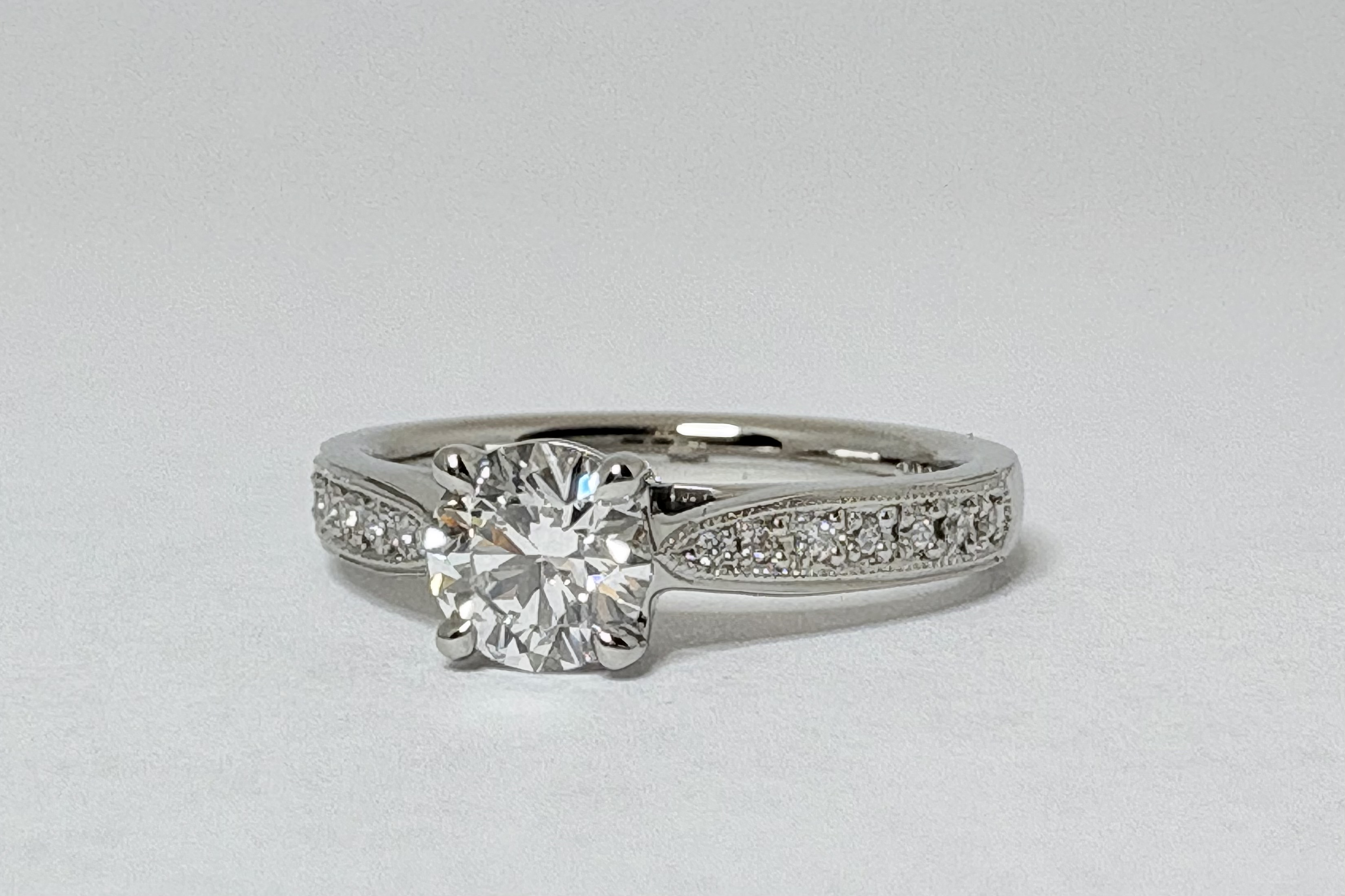 センターのダイヤモンドの両側に、7月7日にちなんだ 7つずつのメレダイヤモンドをセッティングいたしました!一見王道なデザインに見えるかもしれませんが、お二人の為だけの特別な意味を持ったご婚約指輪に仕上がりました。