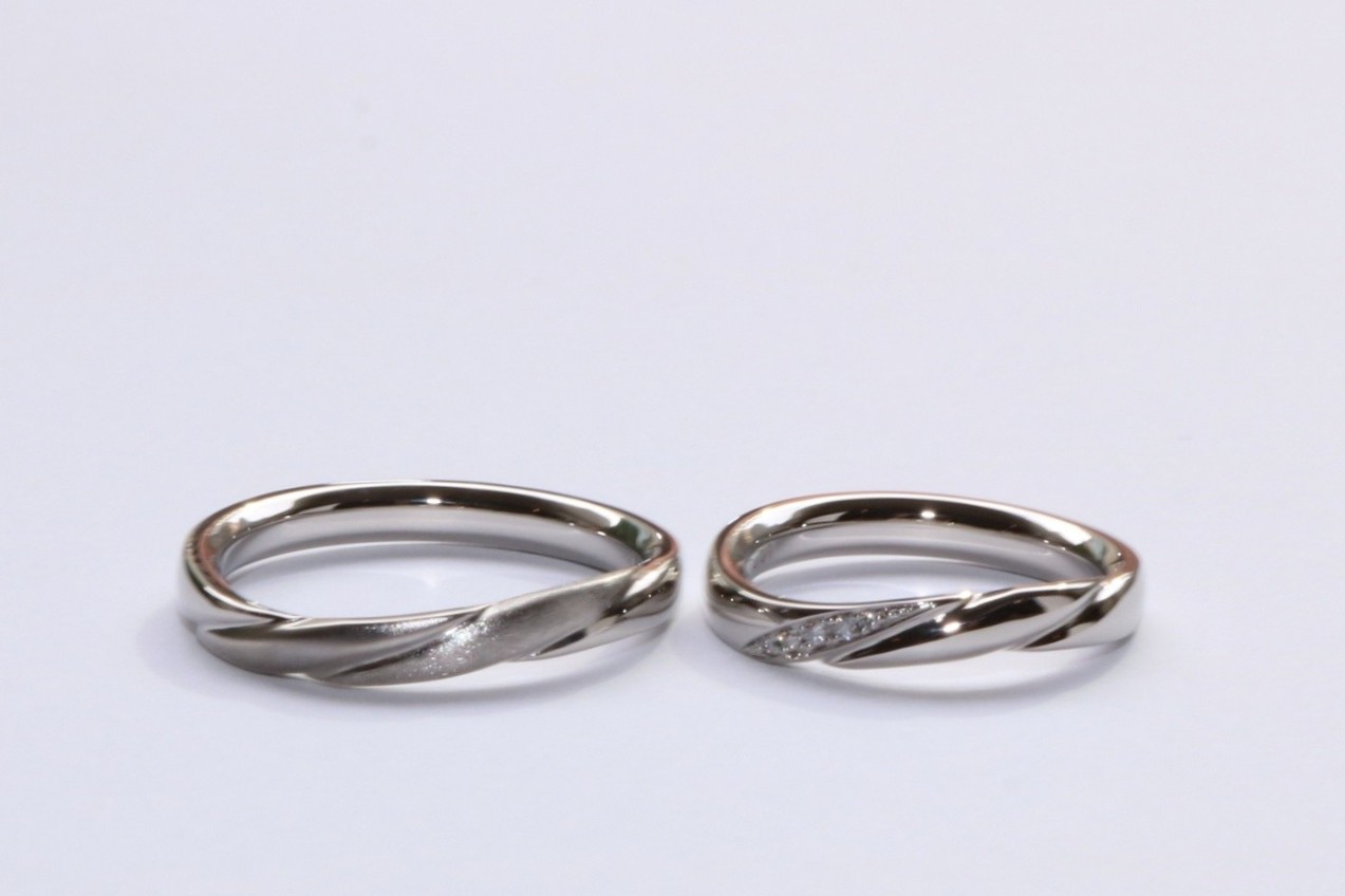 奥様は、鍛造製法ならではの地金の光沢感を大変気に入って下さいましたので、ダイヤモンドの輝きと地金の光沢感と両方を存分にご堪能頂ける鏡面仕上げでお造り致しました!