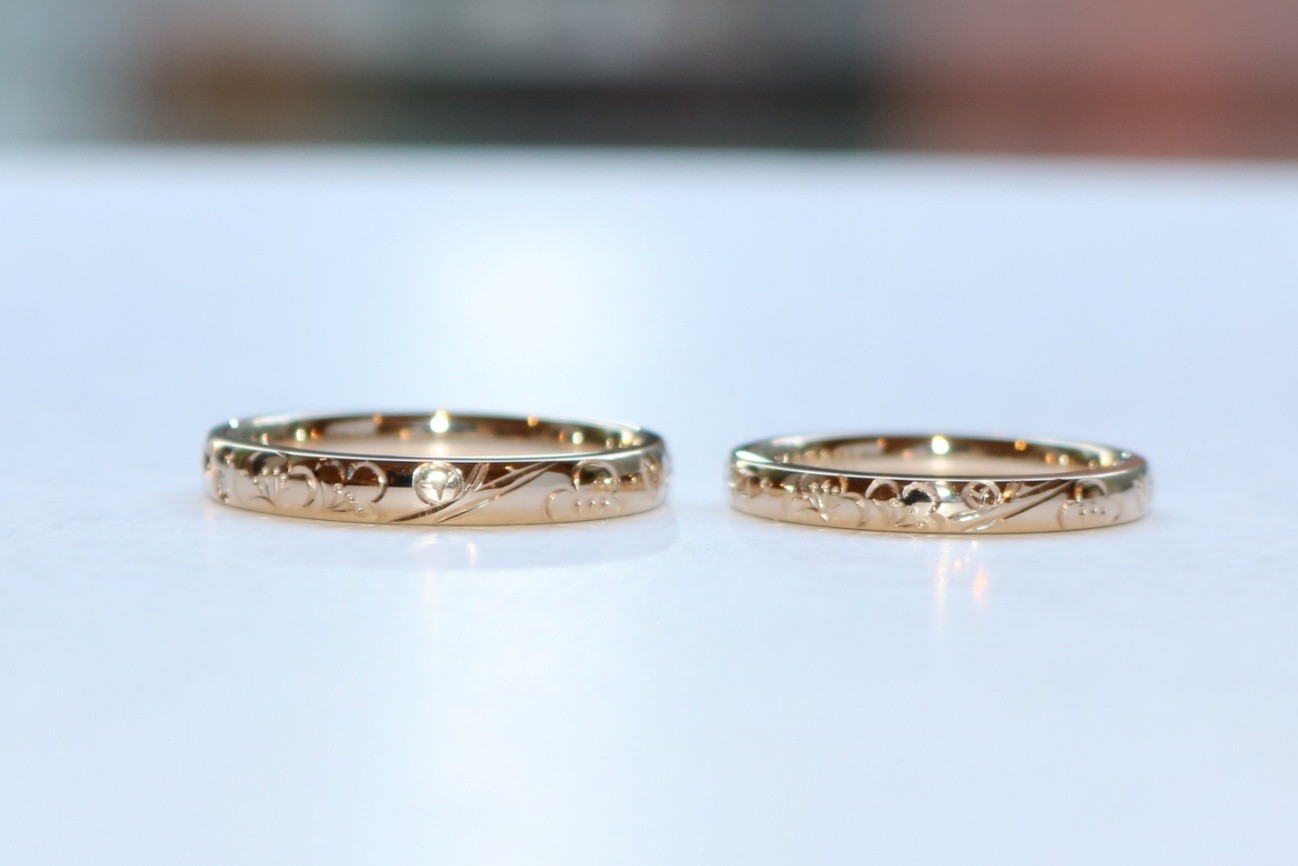 お二人の始まりから未来を、ぐるっと一周にお花で表現した大変素敵なご結婚指輪が完成いたしました!!
