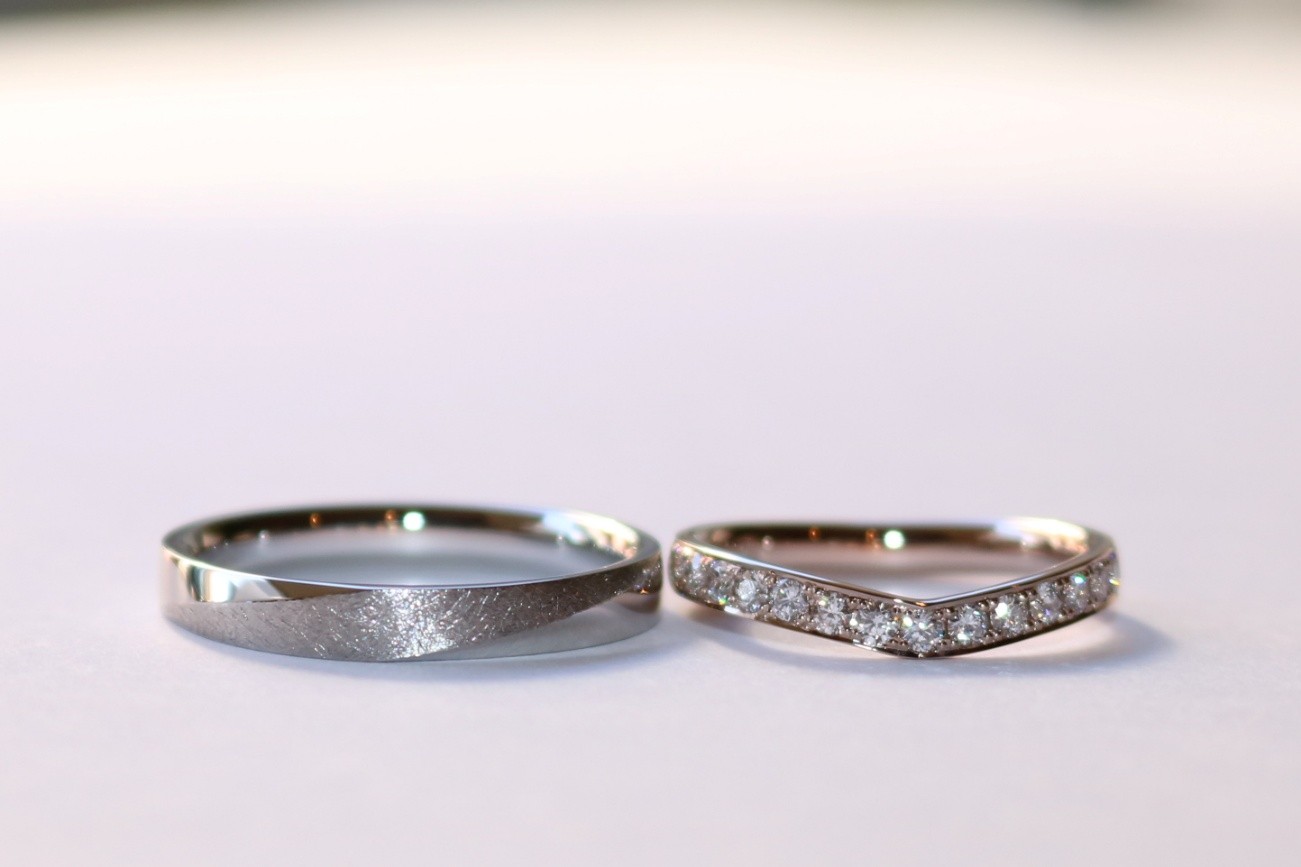 ご結婚指輪というと、ペア感バッチリのデザインを想像される方が多いかと思いますが、実は、ペア感よりも自分たちの好きなデザインで造った指輪を身に着けたいとおっしゃって下さる方も多くございます。