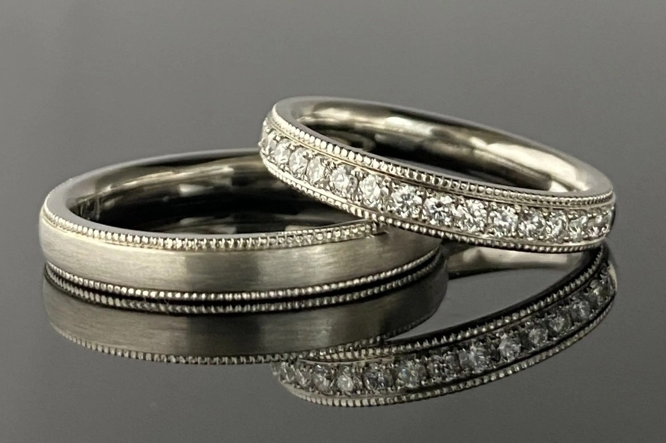 どちらのデザインも、一周ぐるっと角落としやマット加工、ミルグレインが入るデザインで、くるくると回ることを気にせずご着用いただけます。