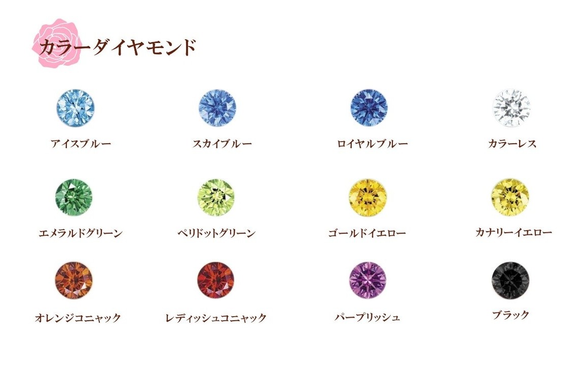 TANZOではカラーダイヤモンドを12色からお選び頂いてお留めすることが可能ございます!なお、ダイヤモンドの個数やお色の配色なども自由にお選びいただくことが出来ます。