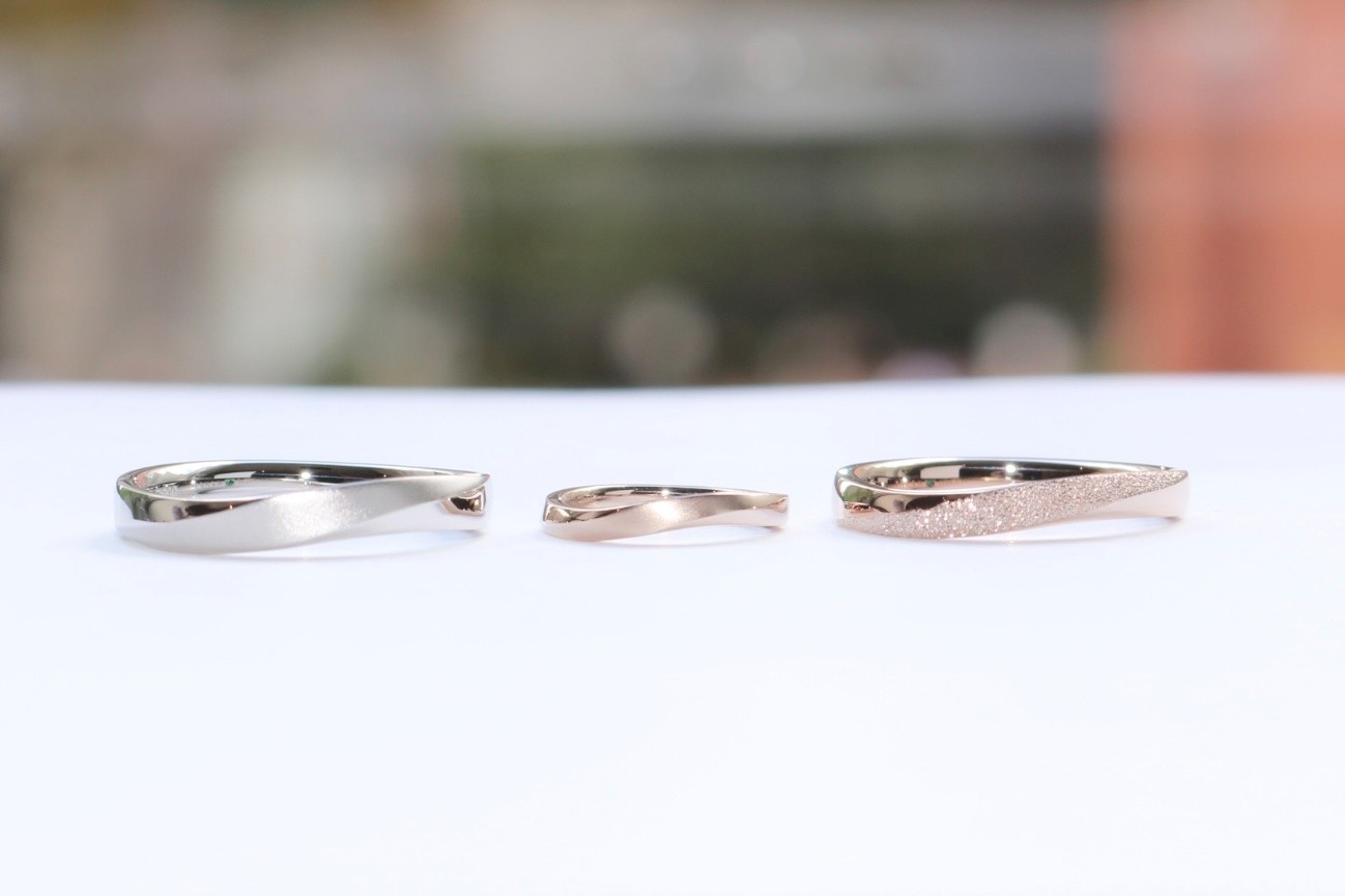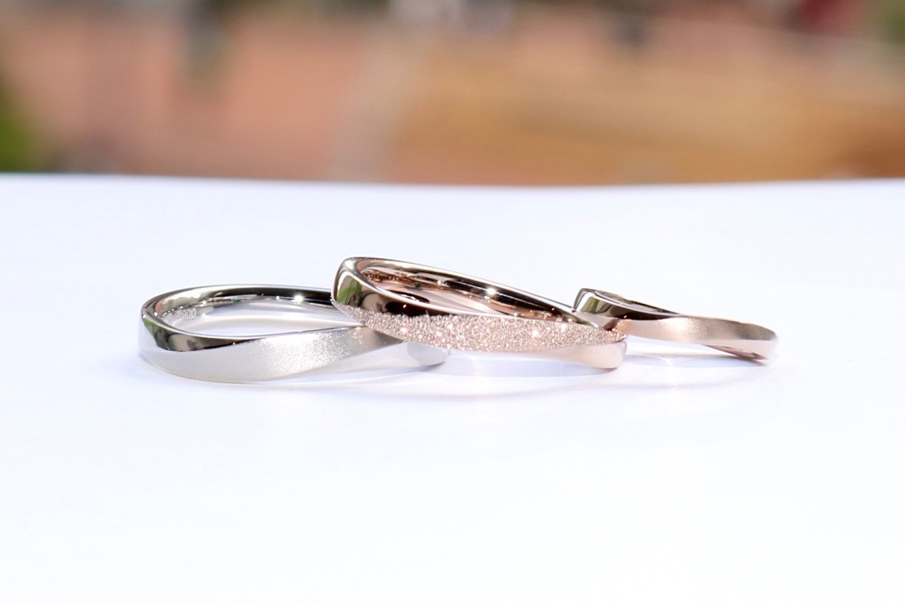奥様は、コーラルゴールドベースに、エッジの中にはスターダスト加工をお入れすることで、お揃い感はバッチリでも、各々で好きな表面加工を施したご結婚指輪になりました!