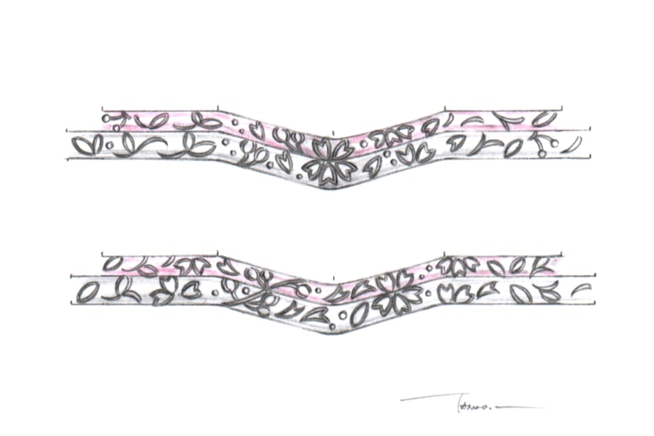 指輪一周にしっかりとデザインを入れるなら桜が咲く季節だけでなく、二人が色んな季節を一緒に過ごしていく思いを表現できないかと、桜が一年を通して移ろいゆく姿を提案させて頂きました。