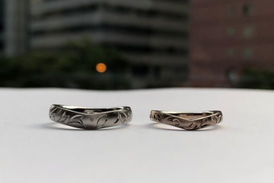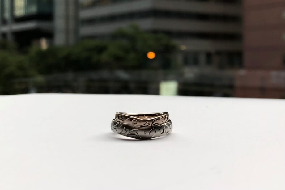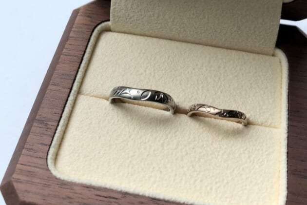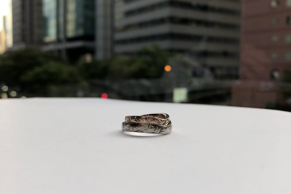 通常、2本の指輪を重ねたときにサイズと幅が異なると絵が重なりにくいことが多いのですが、とっても綺麗に重なったので私も嬉しく、早くお二人に見て頂きたい!という気持ちでいっぱいになりました。