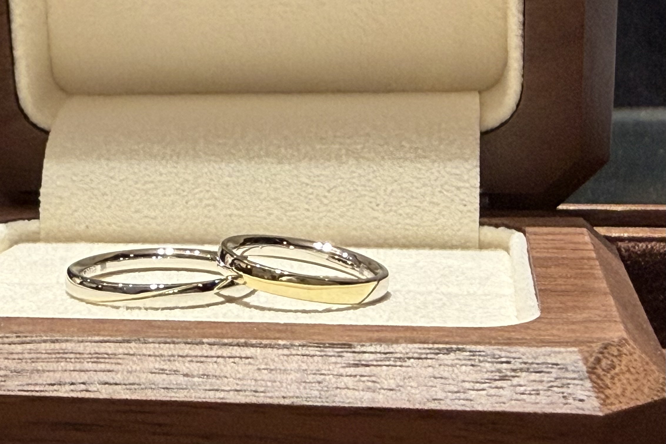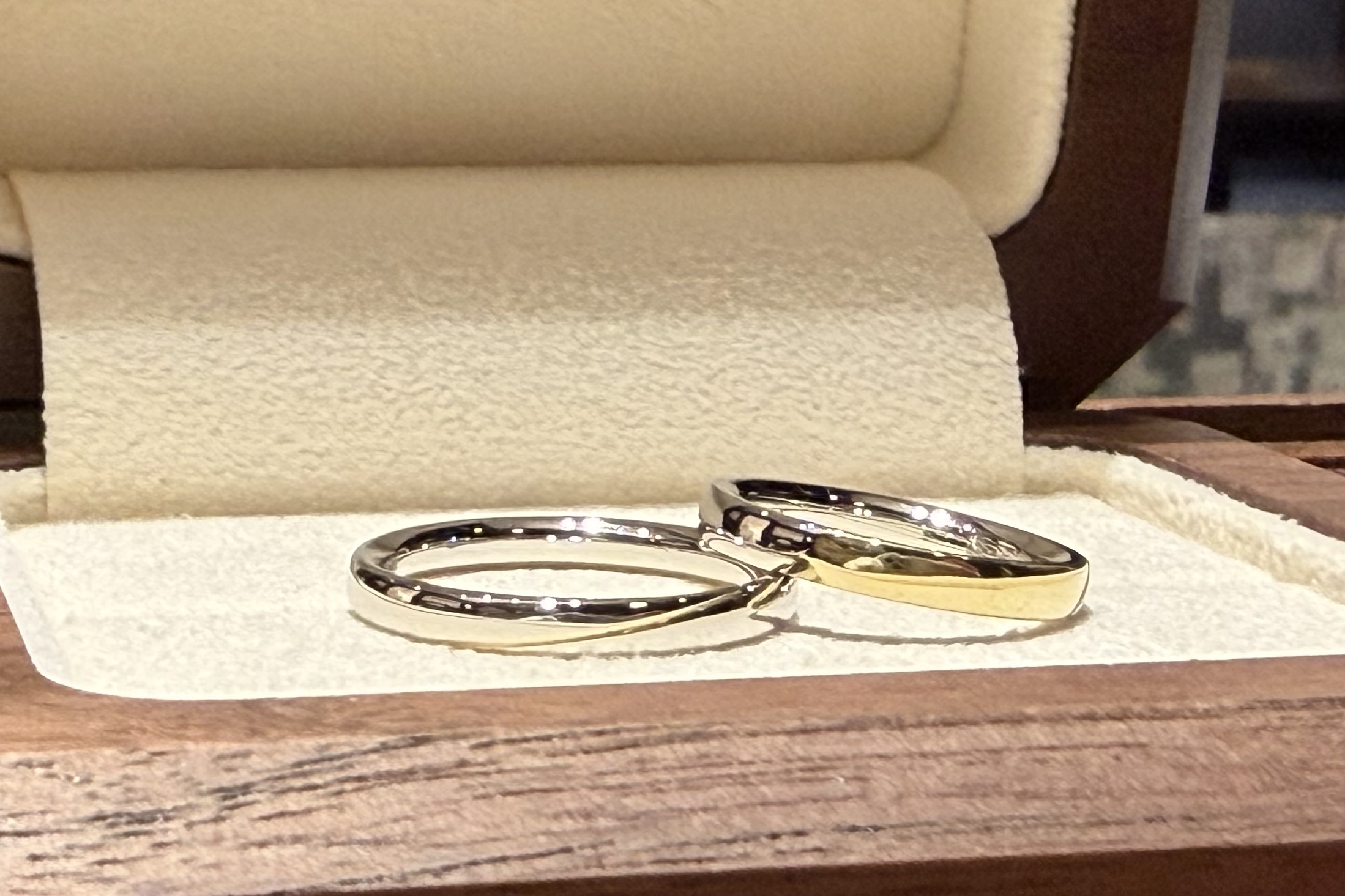 ご婚約指輪はコンビデザインで、プラチナとイエローゴールドの指輪を重ね付けしたようなデザインでございました。ご結婚指輪もそちらに合わせてコンビにしようと思ったそうなのですが、やはりサイズ直しが出来ないことがネックでご結婚指輪探しに苦戦されているとのこと。