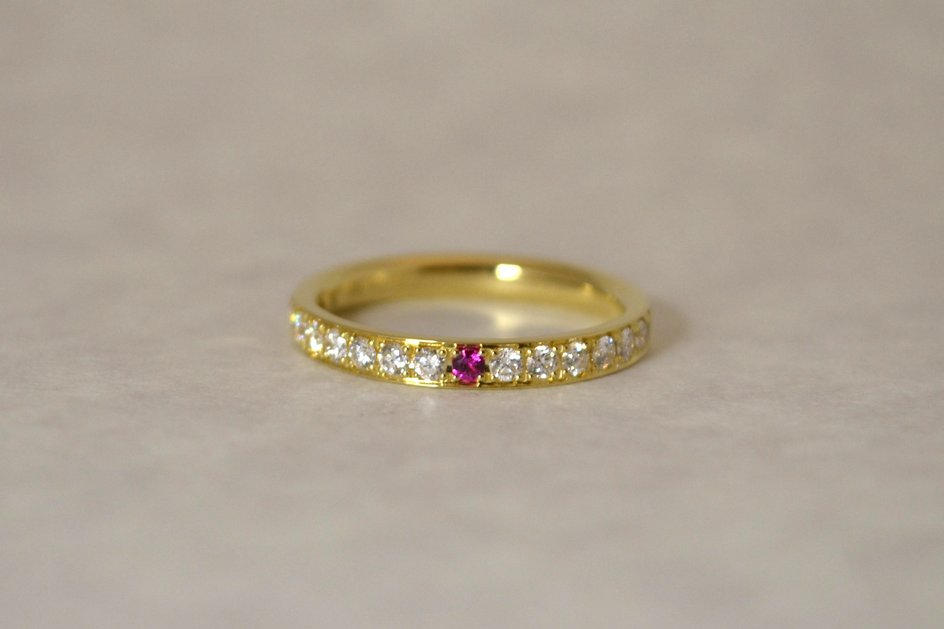 こちらのアイデアを大変気に入ってくださり、完成した指輪は虹色に輝くダイヤモンドの並びに赤く煌めくルビーが大変上品な仕上がりになりました!
