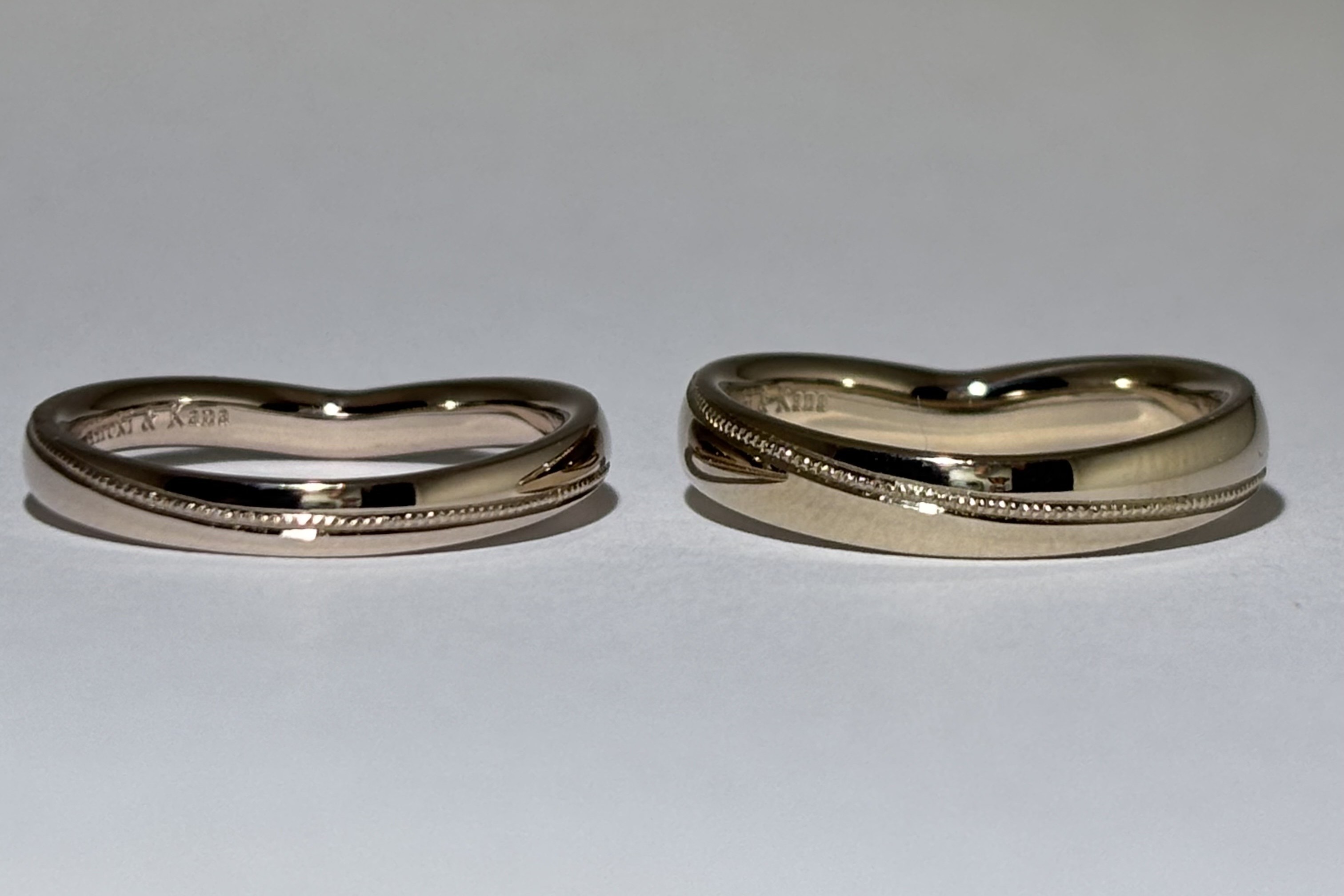 お試し中に数回デザインのご相談でご来店いただき、色々な想いをお話ししていただきました。それから少しずつデザイン案を絞っていき、最終的にはサイズ・幅・形・デザイン、全てが変わり、お二人の最高の指輪が完成いたしました!