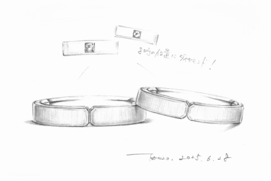 今回は、削りとダイヤの位置を変え、二面性のあるデザインをご提案いたしました。