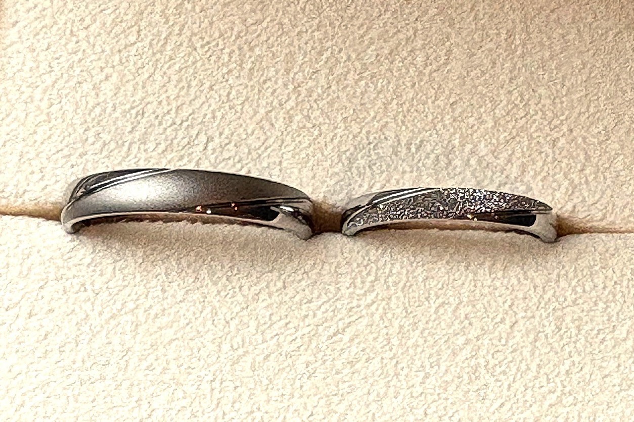 大きなデザインさえ統一していれば、細部の表面加工が違っても、幅の太さが違っても、あるいは金属の色が違っても、ペア感・お揃い感はしっかりと感じられる指輪が出来上がってまいります。